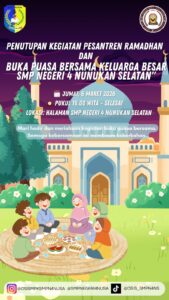 Kegiatan penutupan Pesantren Ramadhan ini akan dilaksanakan pada Jumat, 6 Maret 2026 pukul 16.00 WITA sampai selesai yang bertempat di halaman SMP Negeri 4 Nunukan Selatan. Seluruh siswa, guru, serta warga sekolah diharapkan dapat berpartisipasi dalam kegiatan tersebut.